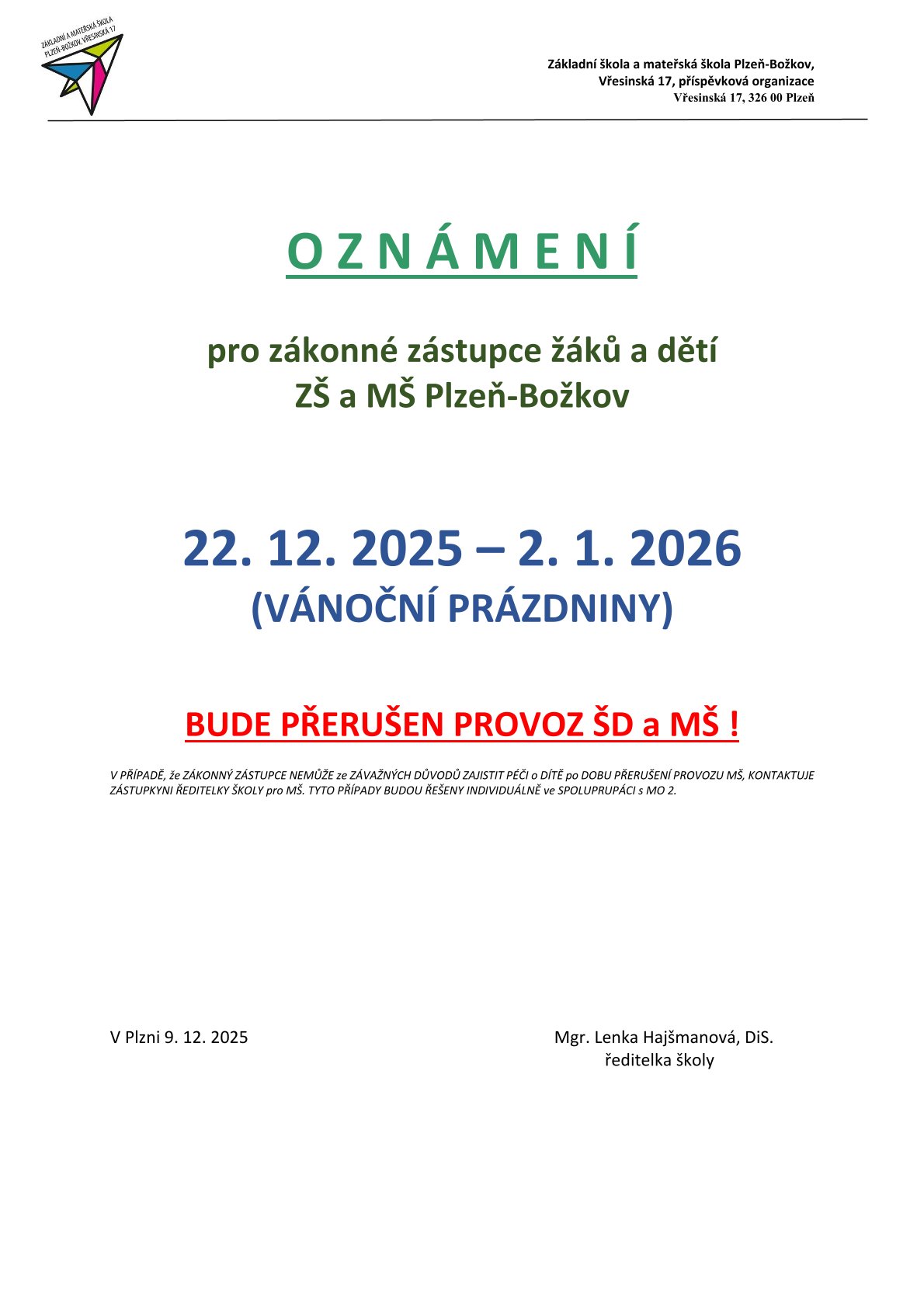 OZNÁMENÍ O PŘERUŠENÍ PROVOZU ŠD A MŠ – VÁNOČNÍ PRÁZDNINY